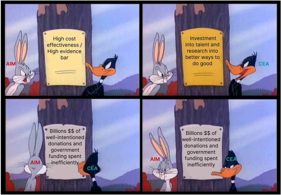 On collaborating/cutting costs: my outside impression is that AIM is already quite good about keeping their costs low and is not shy about being proactive. So my view is something like, if they thought it would be good for the world to collaborate more closely with CEA, I trust that they would have acted upon that belief. This is something that I respect about AIM (at least the version that’s in my head, since I don’t know them).