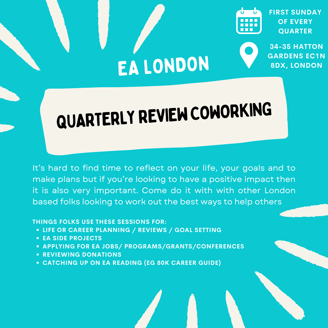 Since they were well received last year, I’m going to be hosting the EA London Quarterly Review Coworking sessions again for 2024.