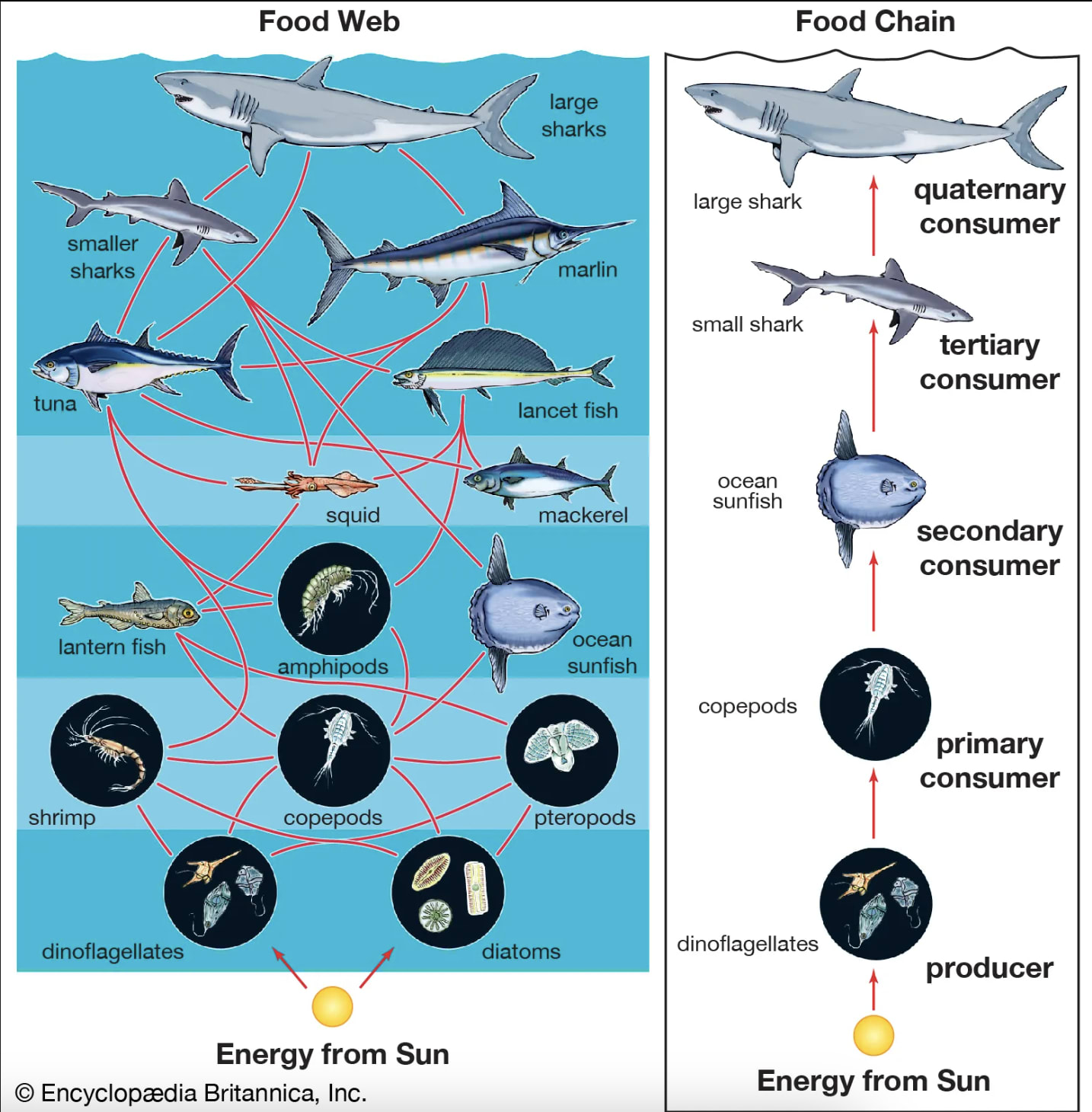 The picture can be complicated by trophic levels not exactly being well-defined as integers or cleanly separable. Peruvian anchoveta eat krill and copepods (Espinoza & Bertrand, 2008, Espinoza & Bertrand, 2014). But then these krill themselves also eat animal plankton, including copepods — and perhaps fish eggs and/or larvae. They are mostly herbivorous according to Ramiro Riquelme-Bugueño et al., 2020, but it’s unclear based on Espinoza et al., 2017, Figure 7, given an estimated trophic levels of 2.8, greater than that for herbivores. Animals that eat the Peruvian anchoveta, whose populations decrease with fewer anchoveta available, might also eat copepods as larvae or juveniles, so reducing the population of anchoveta reduces the populations of their predators and also reduces the pressure from those predators on copepods as well.