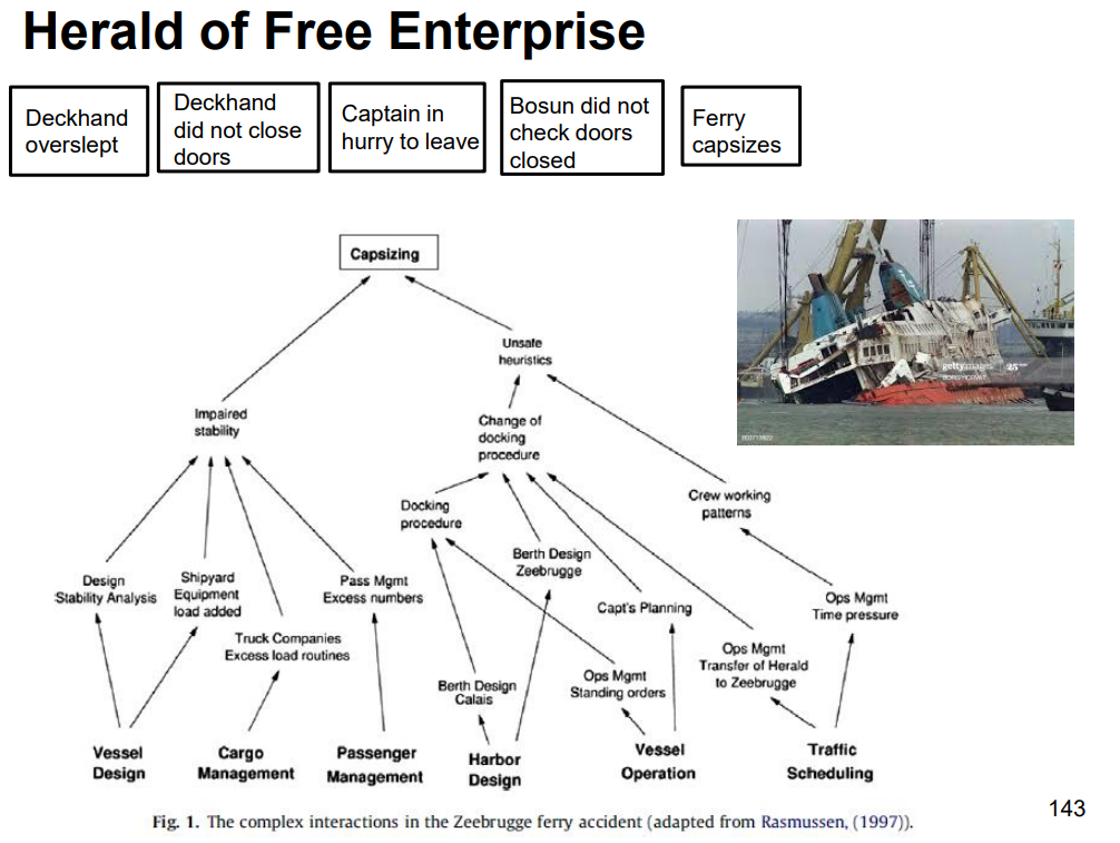 Safety engineers draw diagrams to show how problems/solutions interact. Here’s one showing all the factors before a ship sank (bottom) vs. just ‘step-by-step’ events (top) 🚢