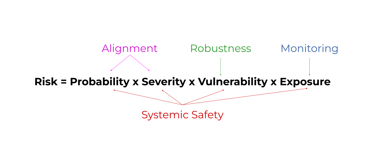 All areas of AI safety reduce some factor in this risk equation. Here’s a diagram as a sneak peak. By the end, you’ll know what these mystical words mean. 😅