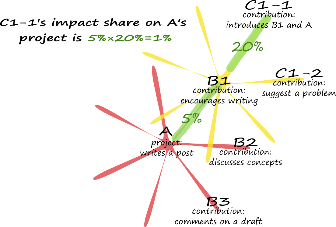 The quality of actions and projects, in addition to their existence, can be influenced. This should be accounted for separately, since the percentage calculations differ. For example, if B1 improves A’s project by 5% (but does not motivate it), B1’s (additive) share of impact is 100%/105×5=4.76%. Total impact is the sum of motivational and additive impact of all influence lines from the considered node to the project.