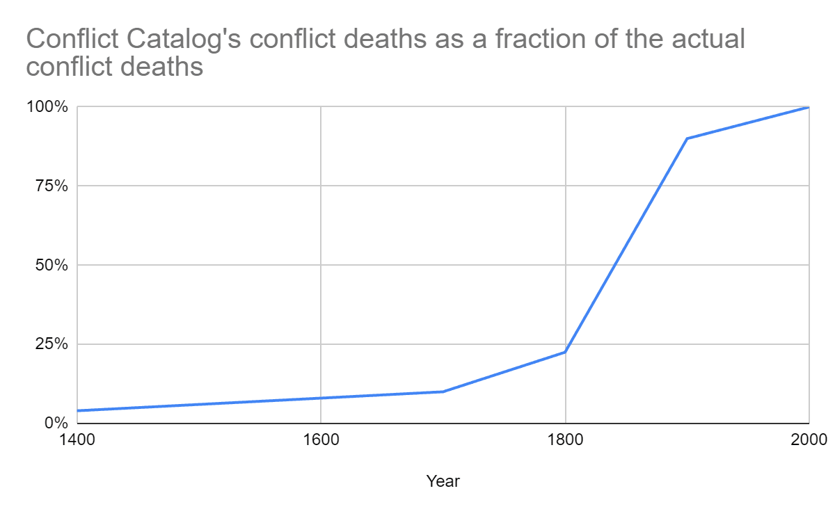 Thanks to Peter Brecke for sharing his thoughts on the annual conflict deaths reported in Conflict Catalog as a fraction of the actual annual conflict deaths. Thanks to Stephen Clare for feedback on the draft.