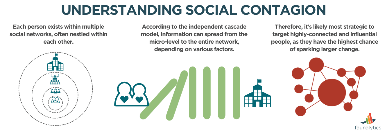 Anyone who has been vegan for a while has likely seen how their diet and lifestyle can influence or spread to those around them. Yet if each vegan was able to create two new vegans, we would have likely seen more significant shifts in the rates of veganism (Our World In Data, 2022) in recent decades. This illustrates the difficulties of understanding social contagion—the process of information (including attitudes or behaviors) spreading throughout a group—especially in relation to veganism. By understanding social contagion better, advocates can improve their diet change outreach, possibly by mastering the art of “vegan contagion.”
