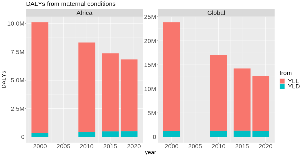 While global trends do suggest that the absolute number of DALYs resulting from maternity is declining, due to effective targeting of maternal mortality rates, the number of years lived with disabilities has remained more or less constant globally, increasing in Africa.[1]