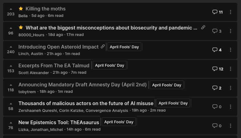 Why are April Fools jokes still on the front page? On April 1st, you expect to see April Fools’ posts and know you have to be extra cautious when reading strange things online. However, April 1st was 13 days ago and there are still twoposts that are April Fools posts on the front page. I think it should be clarified that they are April Fools jokes so people can differentiate EA weird stuff from EA weird stuff that’s a joke more easily. Sure, if you check the details you’ll see that things don’t add up, but we all know most people just read the title or first few paragraphs.