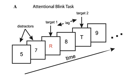 It’s a weird phenomenon. If targets A and B are presented 100 ms apart, both are likely to be correctly identified. If targets A and B are presented 700 ms apart, both are likely to be correctly identified. But if targets A and B are presented ~300 ms apart, only A is likely to be correctly identified.