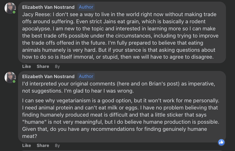 I do feel like vegan advocates are entitled to a certain amount of defensiveness. They encounter large amounts of concern trolling and outright hostility, and it makes sense that that colors their interactions. But that allowance covers one comment, maybe two, not three to eight (Wilkox, depending on which ones you count).