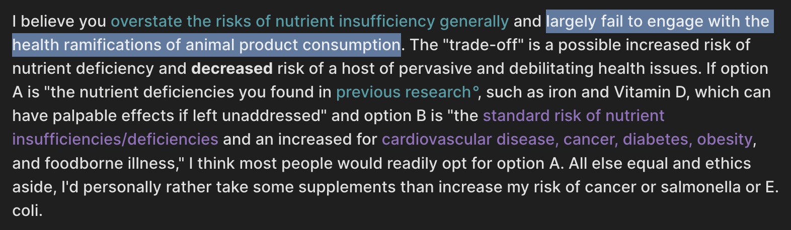 In fact the best data I found on this was from Faunalytics, which found that ~20% of veg*ns drop out due to health reasons. This suggests to me a high chance his math is wrong and will lead him to do harm by his own standards.
