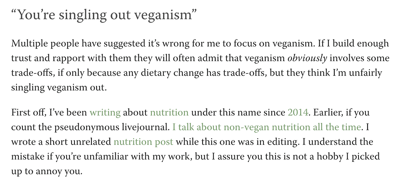 This is by no means unique to posts about veganism. “They’re yelling at me for an argument I didn’t make” is a common complaint of mine. But it happens so often, and so explicitly, in the vegan nutrition posts. Let me give some examples.
