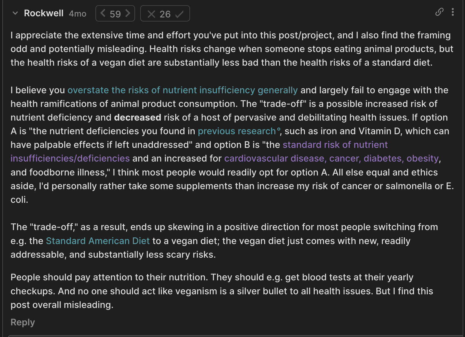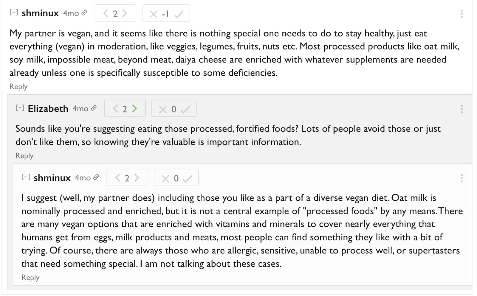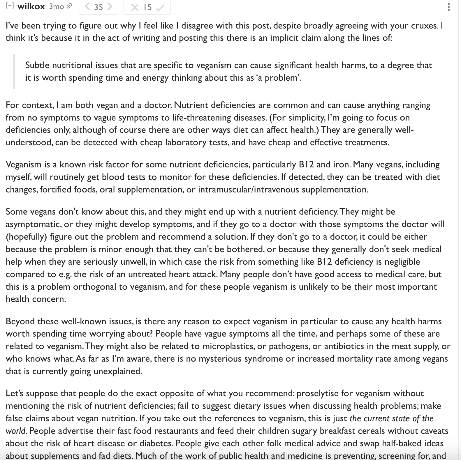 For example, I’ve already quoted Wilkox’s very fuzzy comment (reminder: this was the top voted comment on that post on LW). That was followed by a 13+ comment exchange in which we eventually found he had little disagreement with any of my claims about vegan nutrition, only the importance of these facts. There really isn’t a way for me to screenshot this: the length and lack of specifics is the point.