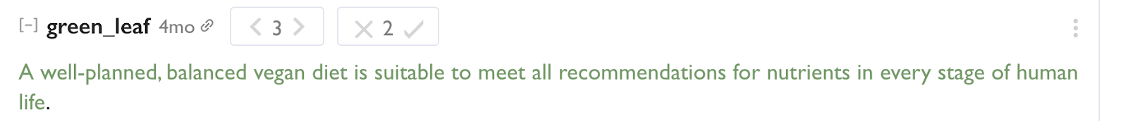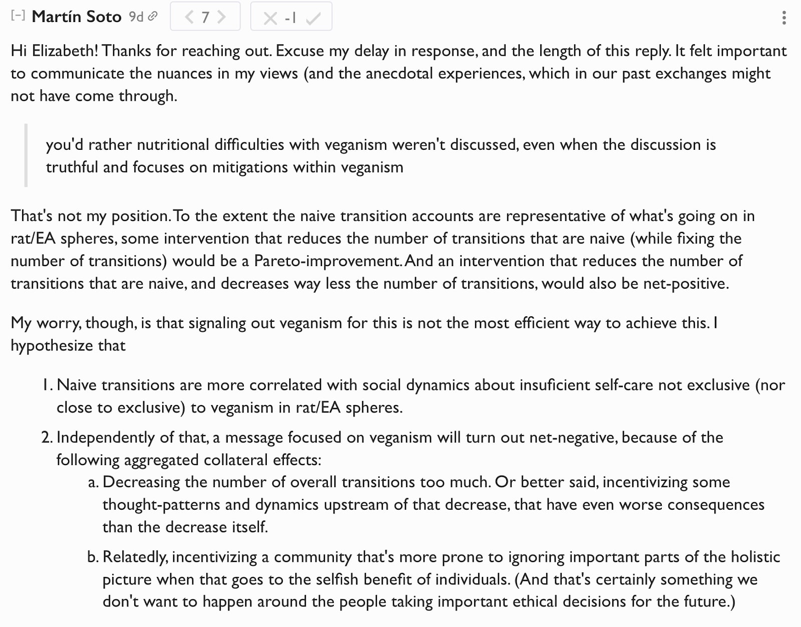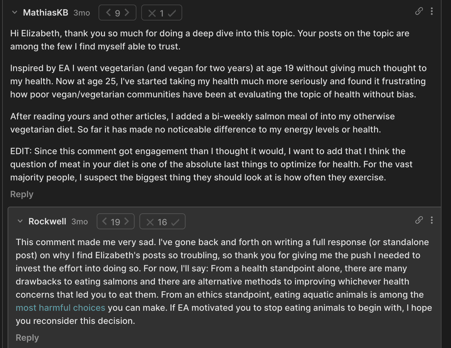 For example, I’ve already quoted Wilkox’s very fuzzy comment (reminder: this was the top voted comment on that post on LW). That was followed by a 13+ comment exchange in which we eventually found he had little disagreement with any of my claims about vegan nutrition, only the importance of these facts. There really isn’t a way for me to screenshot this: the length and lack of specifics is the point.