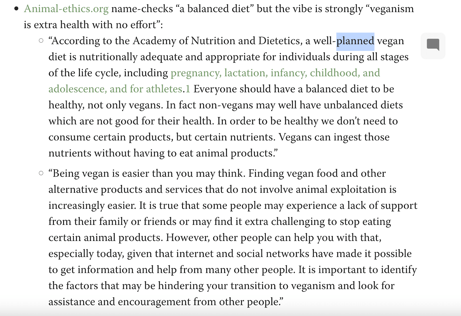 What I see in EA vegan advocacy is deeply terrible citations, thrown out casually, and abandoned when inconvenient. I’ve made something of a name for myself checking citations and otherwise investigating factual claims from works of nonfiction. Of everything I’ve investigated, I think citations from EA vegan advocacy have the worst effort:truth ratio. Not outright more falsehoods, I read some pretty woo stuff, but those can be dismissed quickly. Citations in vegan advocacy are often revealed to be terrible only after great effort.