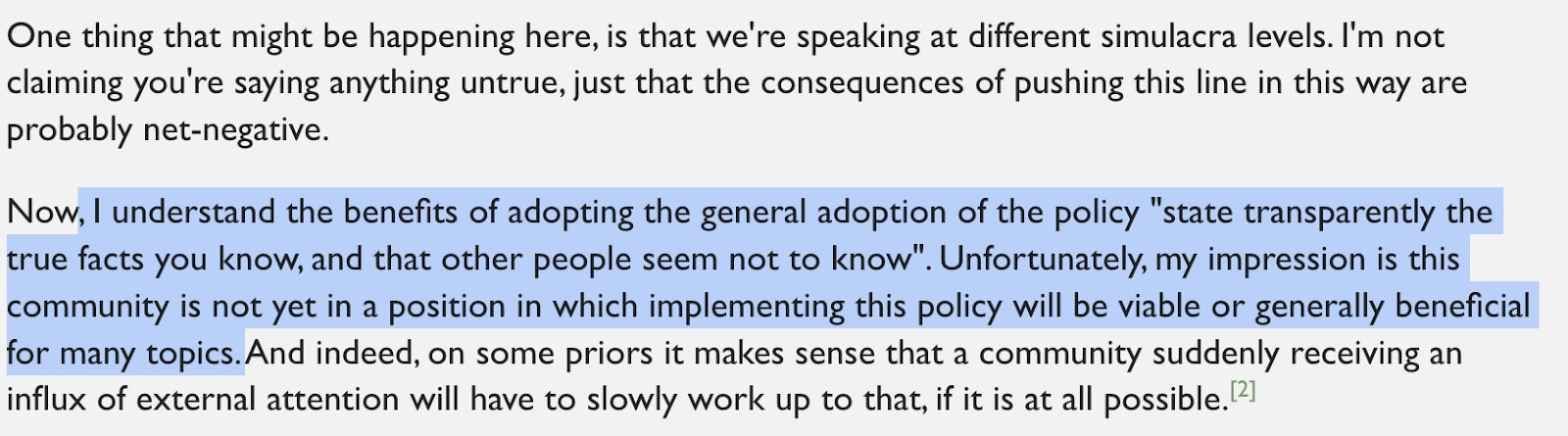 Of course that doesn’t mean I implemented splinter removal competently. I did my best, but the problem is in the pattern of behavior, not any one action, and that’s inherently high-context and hard to explain. I can see ways to make the post clearer, in the sense of a reader with no context immediately understanding it, but they would also have made it less accurate and more inflammatory. There are many times in writing this I explicitly had to choose between being overgenerous to people I quoted, uncharitable to them, or too long. I chose too long and I stand by that decision.