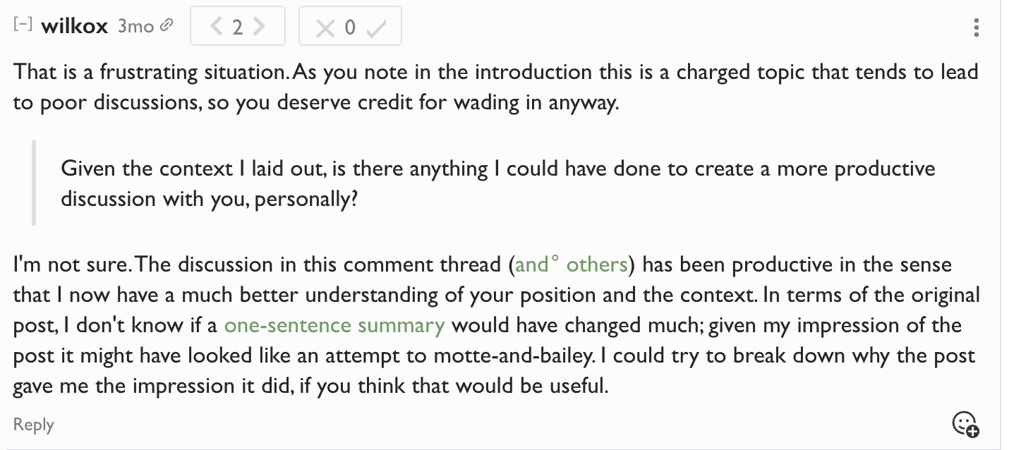 Sometimes someone comments with an intense, strongly worded, perhaps actively hostile, disagreement. After a laborious back and forth, the problem dissolves: they acknowledge I never held the position they were arguing with, or they don’t actually disagree with my specific claims.
