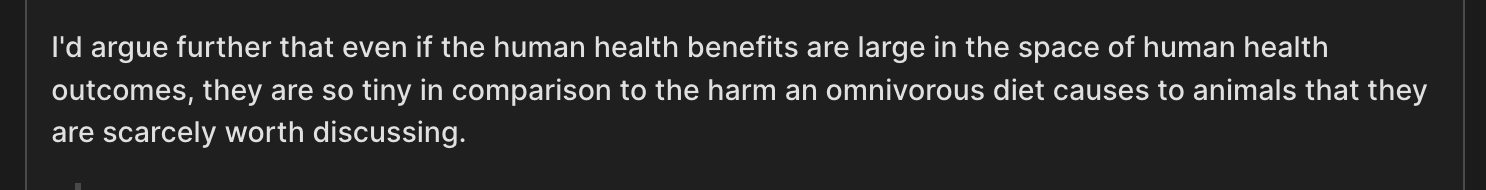 I agree with this principle. I also agree that this post is inflammatory. I worked really hard to make it the smallest amount of inflammation as possible, but it’s still pretty inflammatory. This felt necessary because my attempts to talk about object-level issues in nutrition in sensitive ways met with hostility and inflammation. This despite the fact that I made far more than “a small and marginal effort” to respect vegan ethical principles in my early posts. Not to mention the fact that my work made veganism more sustainable for perhaps dozens of people by motivating testing nutrition testing and treatment.