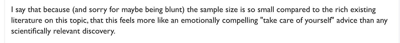 A subtler version comes from the AHS-2 post. At the time of this comment the author, Rockwell, described herself as the leader of EA NYC and an advisor to philanthropists on animal suffering, so this isn’t some rando having a feeling. This person has some authority.