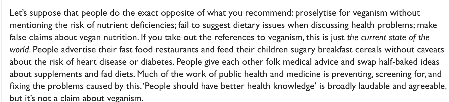 The charitable explanation here is that my post focuses on naive veganism, and Soto thinks that’s a made-up problem. He believes this because all of the vegans he knows (through vegan advocacy networks) are well-educated on nutrition. There are a few problems here, but the most fundamental is that enacting his desired policy of suppressing public discussion of nutrition issues with plant-exclusive diets will prevent us from getting the information to know if problems are widespread. My post and a commenter’s report on their college group are apparently the first time he’s heard of vegans who didn’t live and breathe B12.