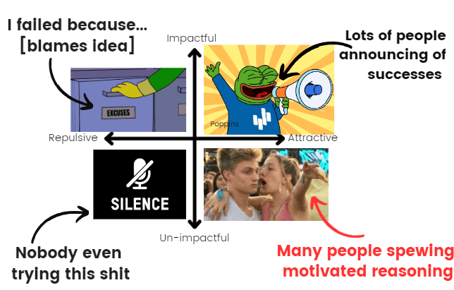 By virtue of being of conferring more social status and enjoyment, attractive ideas get more attention and retain it better. When these ideas work, people make their celebratory EA forum post and everyone cheers. When they fail, the founders keep it quiet because announcing it is painful, embarrassing and poorly incentivized.