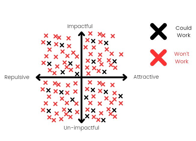 The impactful, attractive ideas that could work have largely been taken (leaving the stuff that looks good but doesn’t work). The repulsive but impactful quadrant is rich in impactful ideas.