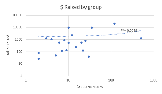 Two of the categories examined were also striking outliers. The top ‘group fundraisers’ did not include the ‘top’ group across most categories and 3 of the 5 places were taken by groups which were not among the largest groups. As this graph shows, relatively little of the variance here was explained by group size: