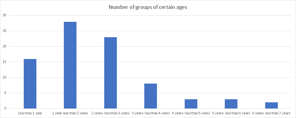 A consequence of this is that even though most groups are younger groups (58% less than 2 years old, >80% less than 3 years old), most members are in older groups.