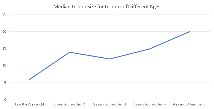 Similarly, the median group size increases with group age (we have excluded the 5-7 year old groups from this graph because with only 2 members in these categories, the median is fairly unindicative):