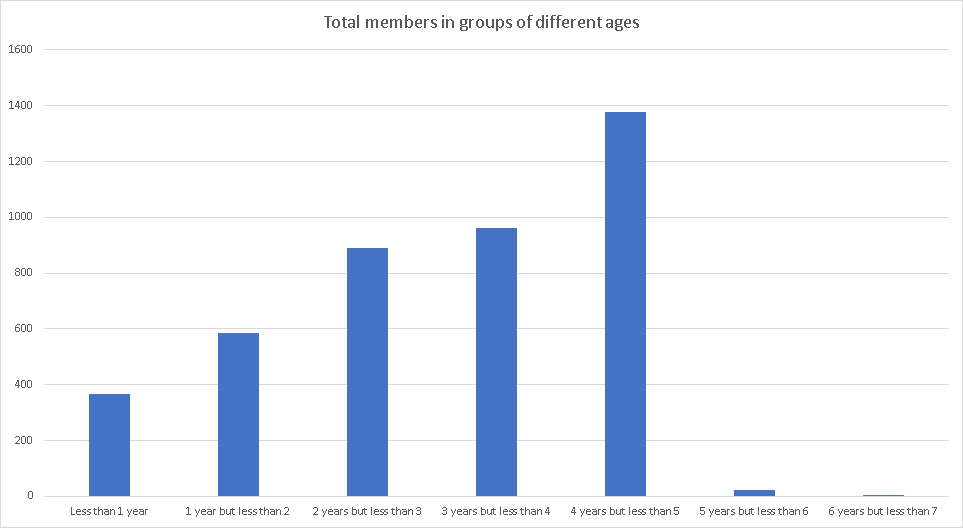 If we look at the number of groups of certain sizes at different ages, we see that while a majority (68%) of groups founded less than a year ago have fewer than 10 members, this proportion declines substantially for older groups (38% for groups 1-2 years old, 33% for groups 2-3 years old, and 14% for groups 3-4 years old).