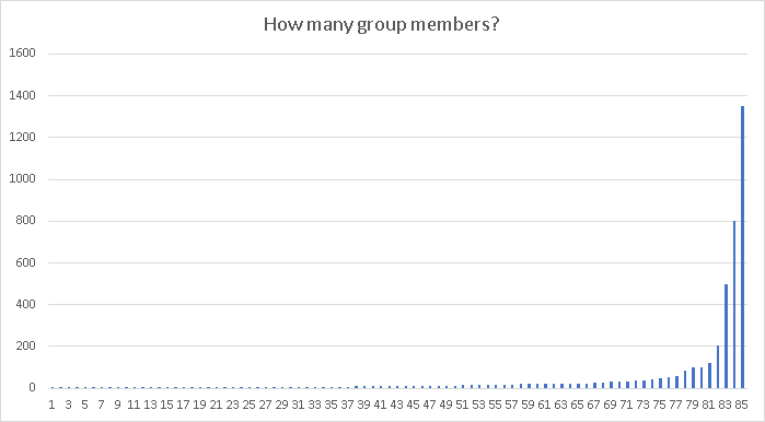 Reported group size ranged from 1 to 1350, with a median of 10. This means that the reported group size numbers are heavily dominated by a small number of very large groups. Of a total 4280 reported group members, across all groups, more than half the reported members come from the largest 3 groups, almost 70% from the largest 5 groups and almost 78% from the largest 10 groups. By contrast, more than 50% of groups contained 10 members or fewer and slightly more than 76% reported 20 members or fewer.