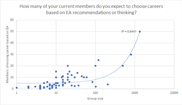 Moreover, as we noted in the quantitative report, the data did not suggest that larger groups were better at producing outputs from their members (e.g. getting members to make career choices based on EA) - in fact, there appeared to be a weak negative relationship between the size of a group and the proportion of members who were basing career choices on EA or taking the pledge (plausibly explained by the fact that larger groups may contain relatively more new members and smaller groups may contain, as a proportion of their total size, relatively more core organisers).