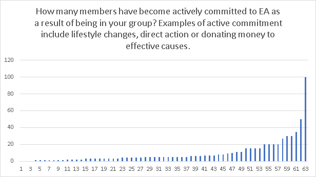 Readers may be concerned by the fact that so many individual groups appear to be so small (for example, 9⁄85 contain fewer than 4 members). Likewise, looking at various metrics of impact, it is reliably the case that a number of groups report little impact. If many EA groups are largely quiescent or inefficacious, then this may be a matter for concern.