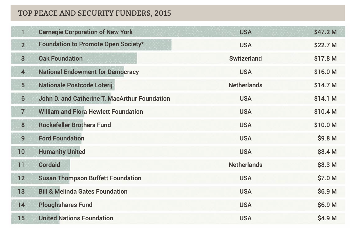 Within the parameters of economic cost we explored the costs of ongoing conflict according to data collected in 2016. It was concluded that $14.3 trillion, or 12.6% of the global GDP, of productivity are lost to ongoing conflict each year, though this includes costs associated with forms of violence other than communal violence. Below is a table that represents the 15 communities and organizations that provided the most grant-based funding for peace and security in 2015. First and foremost is the Carnegie Corporation of New York, which provides $47.2 million in grants, more than double the next highest foundation, which is the Foundation to Promote Open Society, which provided $22.7 million in grants. The last member of the list, the United Nations Foundation, contributed $4.9 million dollars in grant opportunities. An important note is that the top ten funders of peace and security grants account for 49% of the total funding within the context of the Peace and Security Funding index, which accounts for 336 foundations. Additionally, the median was $100,000.