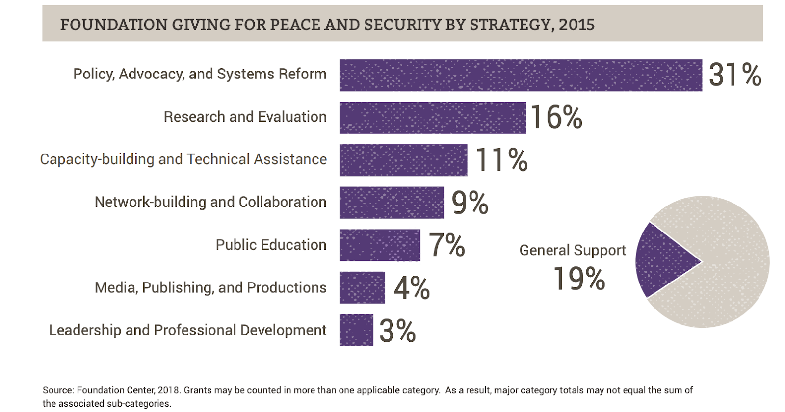 We have previously established who is providing the funding for grants as well as the median costs of these grants. But, it is equally important to understand how the money is being used and what systems are being prioritized. In the graph titled. Foundation Giving for Peace and Security by Strategy we see that 31% of the money goes to “policy, advocacy and systems reform”. Next, we see that “general support” receives 19% of the total funding. “Public education” is a low priority funder and as a result only received 7% of the $351 million in grants the Foundations Center and Peace and Security Funders Group studied. That being said, it is in many cases expensive to maintain and build sustainable elementary and secondary schools that promote peacebuilding and education. Lastly, the graphic shows “media, publishing and productions” only received 4% of the funding that applied to the study and the lowest funding group was “leadership and professional development”, which acquired only 3% of the funding.