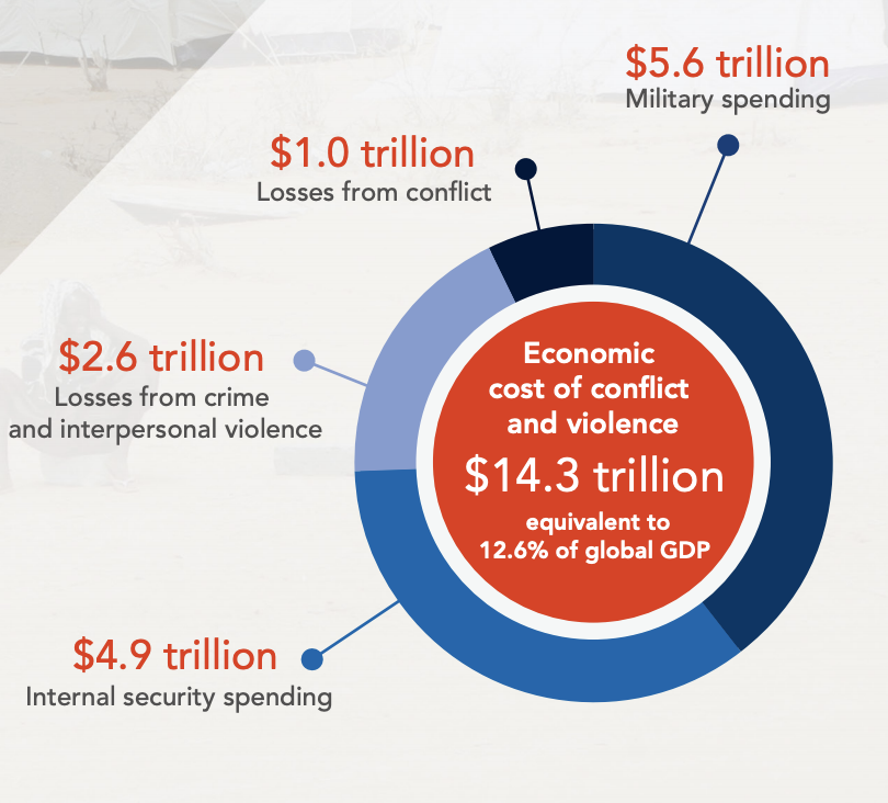 Economic cost: An estimated $14.3 trillion (in PPP-adjusted terms) was lost in 2016 as a direct result of conflict (this includes all forms of violent conflict, not just communal conflict), which included $5.6 trillion on military spending, $1 trillion from losses caused by conflict, $2.6 trillion lost from crime and interpersonal conflict, and the final $4.9 trillion on internal security spending. In comparison, only $10 billion was spent on peacebuilding programs in 2016, for both communal and interstate conflicts, which is equivalent to less than 1% of the cost of war. At the same time we see that $12 billion is spent on refugee aid annually, according to the United Nations’ Pathways for Peace. There are also more difficult-to-measure costs, including losses of foreign direct investment as a result of lower investor confidence and increases in interest rates on foreign debt due to perceived economic insecurity.