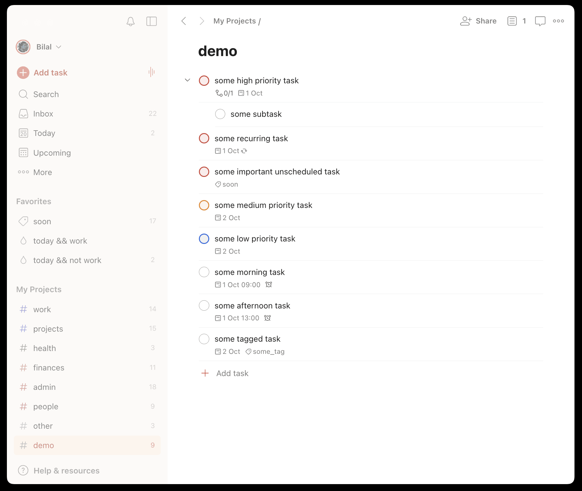Here’s what my todoist set up looks like, for inspiration. You probably shouldn’t copy it exactly. I’ve iterated towards this over the course of years, and in general try to only add complexity when I’m certain it will be helpful. When I just started out, the total complexity was significantly lower.