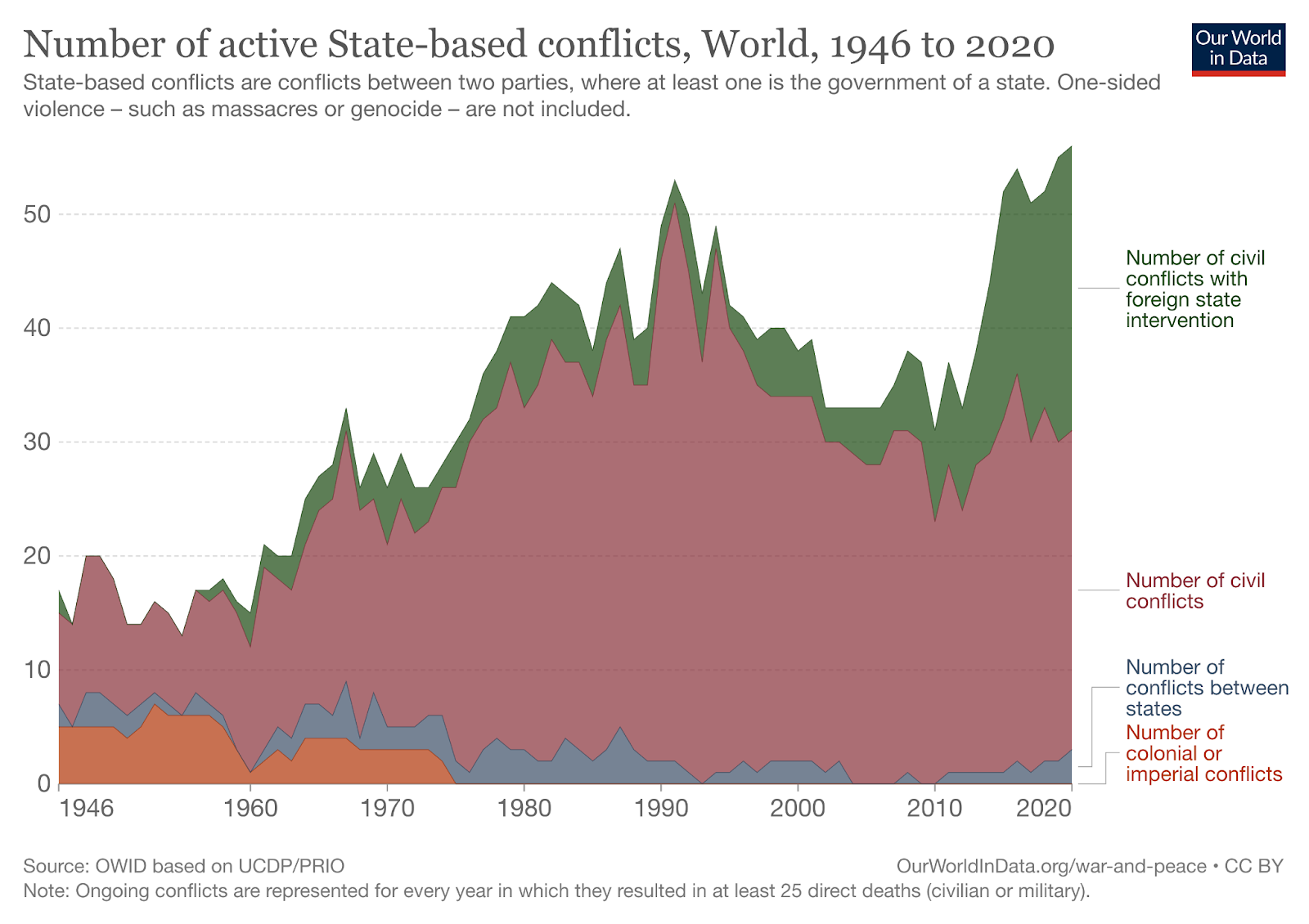 The number of conflicts has been going up since ~1950; but deaths in state-based conflicts have declined a lot.