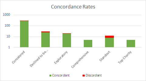 Note the y-axis is logarithmic. This particularly affects the “Standout” column, which is about half concordant and half discordant. For standout and Top Charities, “concordance” means they got grants from Open Phil; for other recommendation types, “concordance” means that they did not get grants.