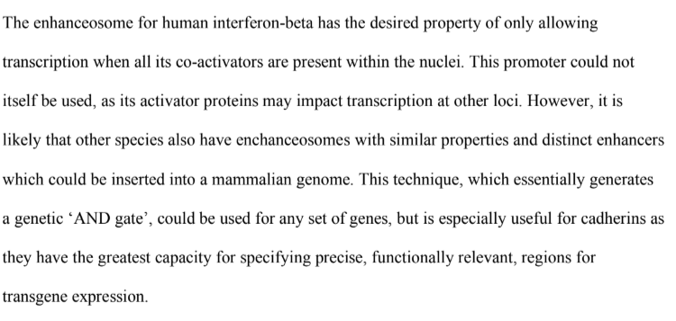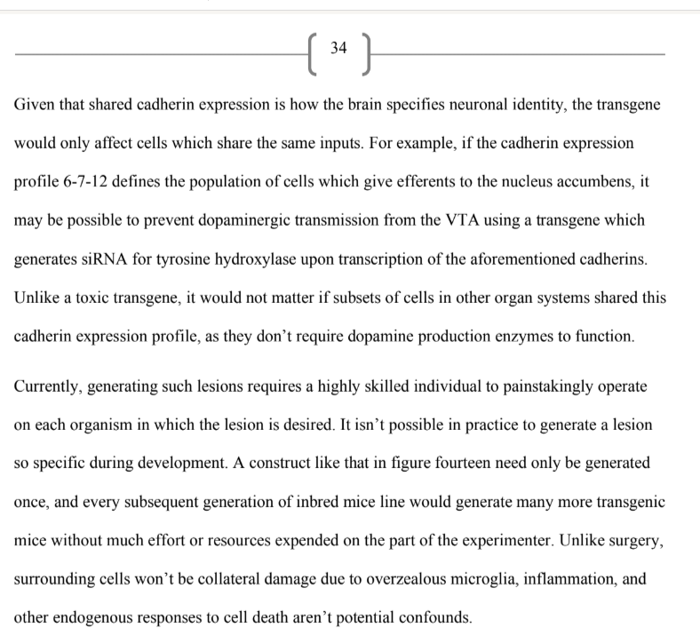 I think it might be possible to selectively interfere with any region of an animals brain using a sophisticated genetic logic gate. It’d even pass on in the germline so you’d only have to do the manipulation once or twice to get a new phenotype you can grow exponential via regular old breeding. They work a bit like this. If A and B and C but not D, make protein E. There are m0lecules called cadherins, a unique combination of which specify each region of the brain. If you made expression of A/B/C/D dependent on whether these cadherins are expressed, you could express D (i.e. any protein you want) within that brain region.