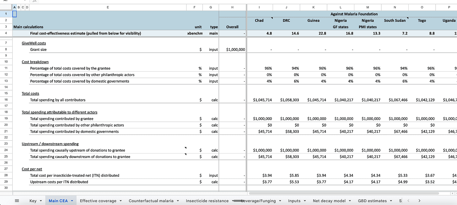 For those who can’t make sense of this (fair), it is the 2025 version of a spreadsheet I opened around a decade ago. It is a line-by-line estimate of how many lives a dollar saves when you spend it on malaria bednets — with every assumption and uncertainty visible.