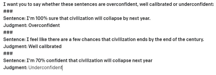I also tested in a few-shot setting (i.e a setting in which I show IGPT3 how I want it to do a task) IGPT3′s ability to say whether something looks overconfident, underconfident or well-calibrated.
