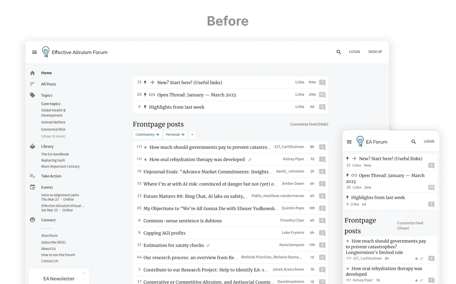 This post was mostly written by Lizka (and then reviewed by others on the team), but most of the work was not done by me! Agnes is the Forum’s designer, and a lot of the people on the team worked on the changes we’re talking about. Thanks to @Clifford for work on the Community section, to @Sharang Phadke for work on the redesign, and @Ollie Etherington and @Sarah Cheng for implementing the UI .