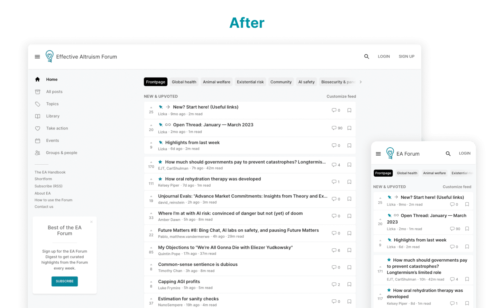 Some people expressed a worry that having a section like this would hide discussions that the community needs to have, like processing the FTX collapse and what we should learn from it, or how we can create a more welcoming environment for different groups of people. We were also pretty worried about this; I think this was the thing that I thought was most likely going to get us to reverse the change.[4]