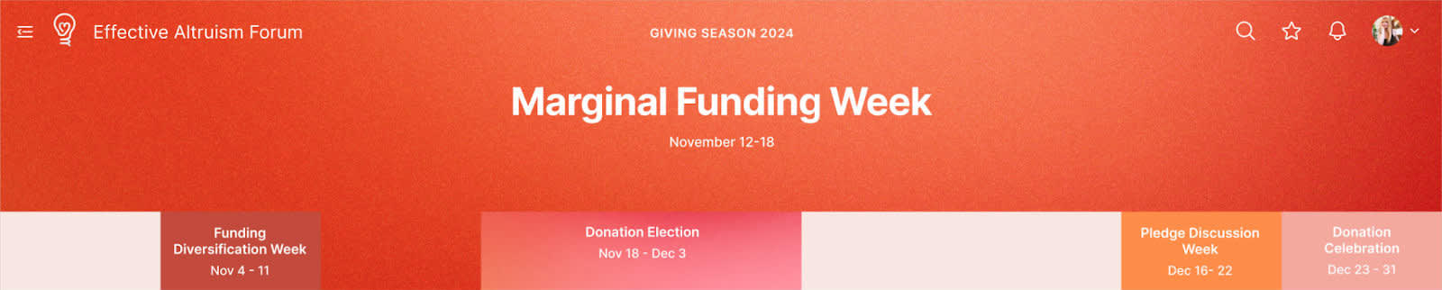 Giving Season 2024 will be running from November 4th to December 31st. The Forum will look seasonably pretty, and we’ll run several mini-events, including an interactive donation election, a marginal funding week, a donation celebration, and multiple AMAs.
