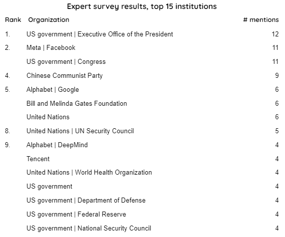 The survey results indicated a surprising degree of convergence across respondent backgrounds and perspectives. The US Presidency/executive branch, US Congress, the Chinese Communist Party or the Chinese government more generally, and Meta/Facebook were each nominated by more than a third of respondents. Other institutions named at least five times include Alphabet (particularly the Google and DeepMind divisions), the Bill and Melinda Gates Foundation, the United Nations generally, and the UN Security Council.[1]