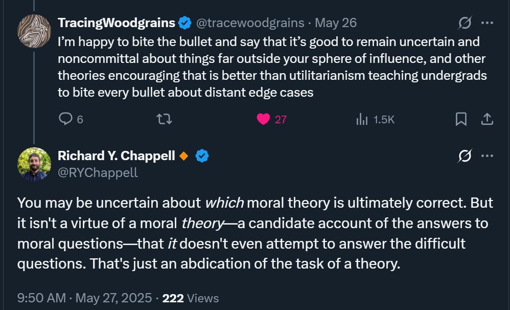 You can see my response: uncertainty is for people, not theories.[4] But perhaps we can add this to my list of paired mistakes forming protective equilibria: Really, you should never fully commit to any one moral theory, and the theories themselves should aim to comprehensively answer (all) moral questions. But if you fail on the first point and are psychologically disposed to go all-in on whatever you “believe” (rather than sensibly spreading your credence around), then you may do best to also accept an incomplete and non-committal theory!