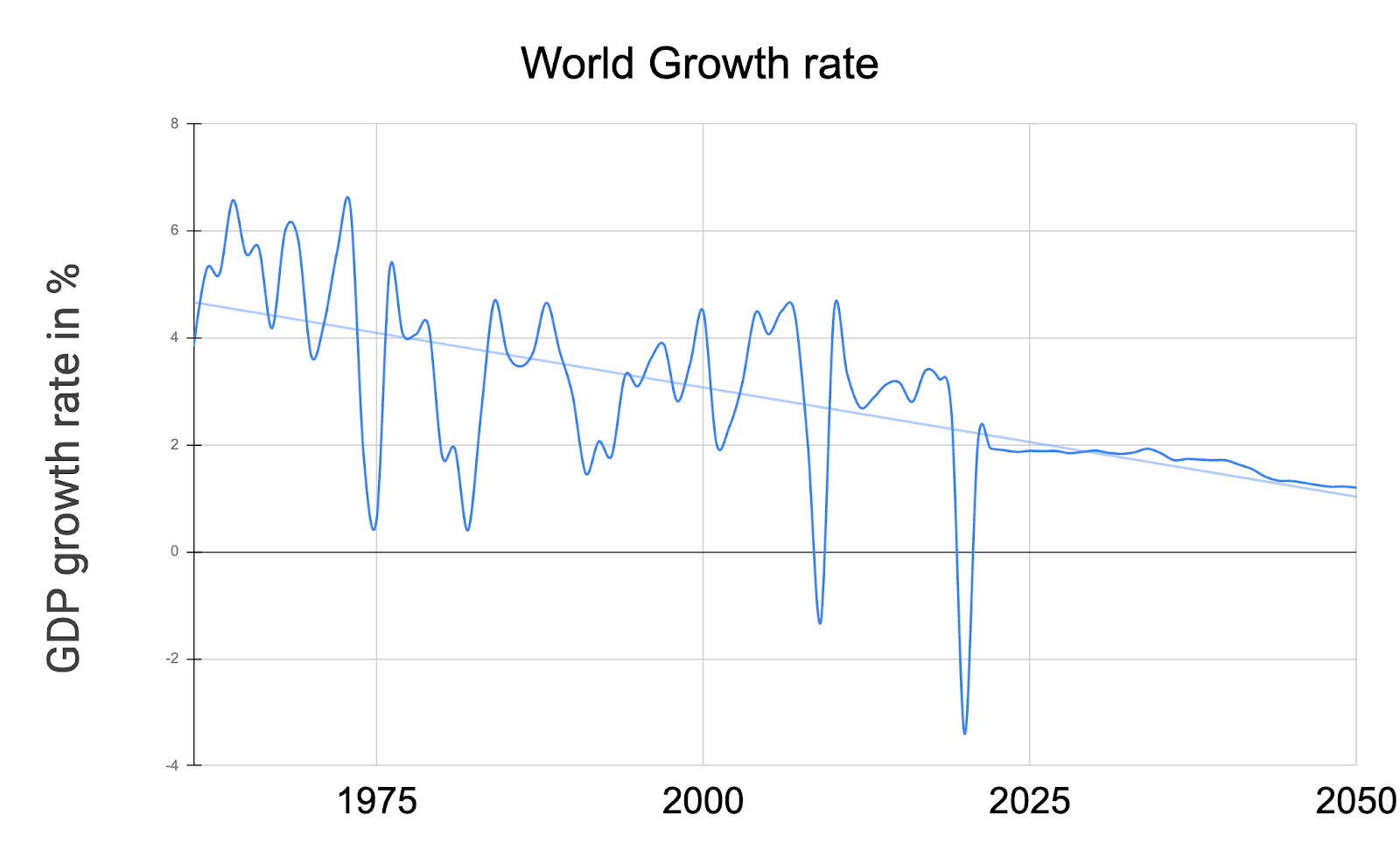 World GDP growth seems to be slowing down from ~5% per year in the 1960′s, to ~4% in the 70s, to ~3% in ’80s, ’90s, ’00s, to ~2.5% in the 2010s. I naively extrapolated this trend[57] and found ~2% in 2030 and 1% in 2050: