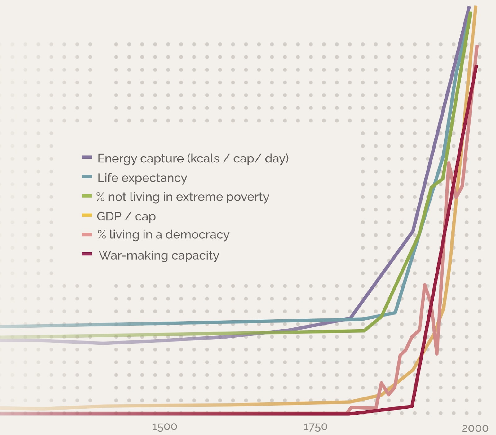 How the World Really Works: The Science Behind How We Got Here and Where We’re Going: In 1800, we needed 10 mins of human labor to produce 1KG of wheat, now it’s two seconds; and we now use ~700x more energy than people in 1900.[76]