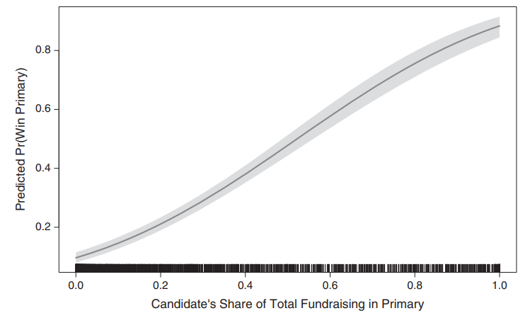Here’s Bonica’s regression for the probability of victory vs. the candidate’s share of total fundraising.