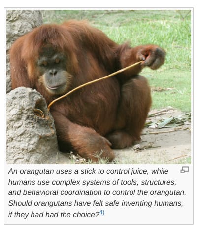 But moreover, the whole thing is one of the strangest passages of text I’ve ever read! “An orangutan uses a stick to control juice, while humans … control the orangutan” is a really abstract and uncommon use of the word “control” which makes no sense outside of deep rationalist circles, and also sounds like it was written by aliens. Here’s my attempt to do better: