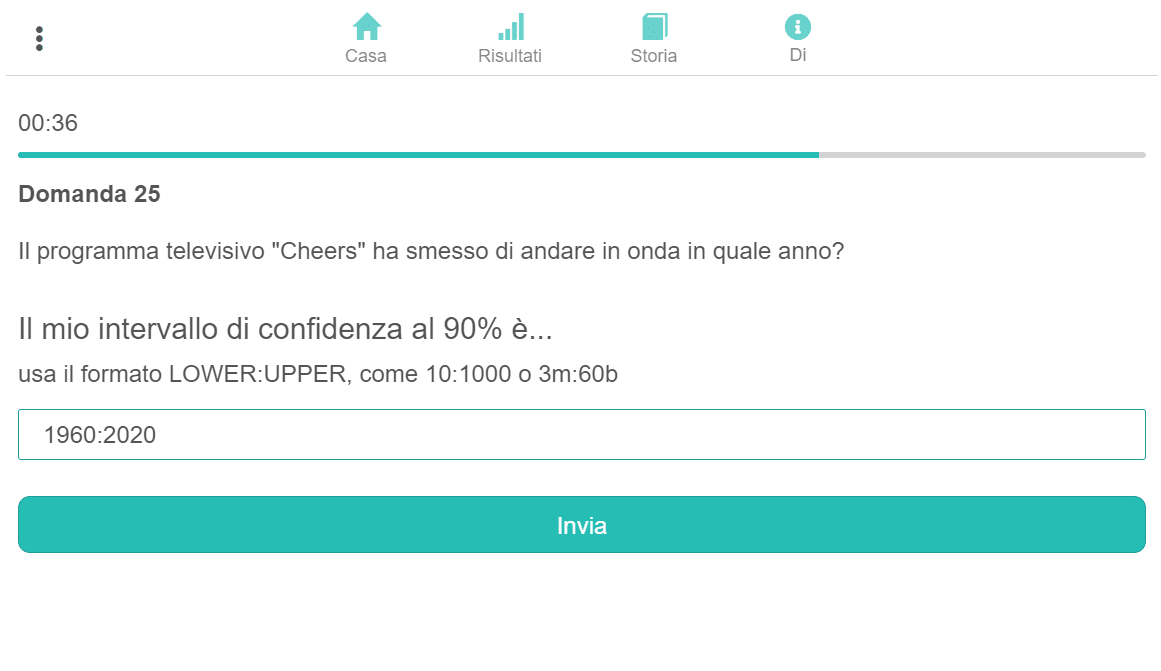 Questo esercizio ha come obiettivo quello di farti diventare ben calibrato. L’app che userai contiene migliaia di domande, che consentiranno molte ore di allenamento alla calibrazione, e misureranno quanto accurate sono le tue previsioni e produrranno un grafico del tuo progresso. Nessuno è perfettamente calibrato; anzi, molti di noi hanno troppa fiducia di sé. Ma ci sono vari studi secondo i quali questo tipo di esercizio può migliorare rapidamente l’accuratezza delle tue previsioni.